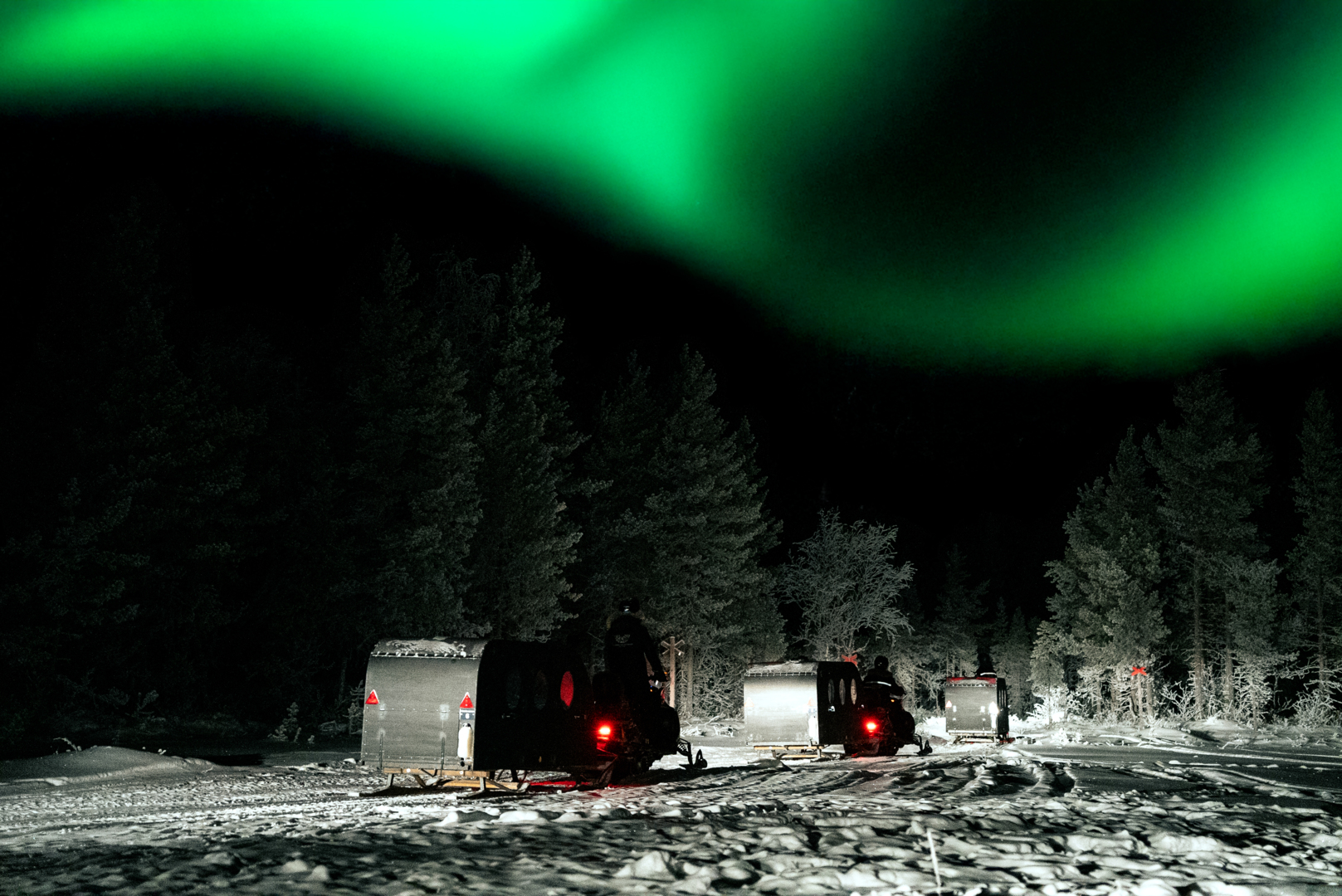 Relax in the heated Aurora sleigh and glide through starlit wilderness, chasing the Northern Lights.