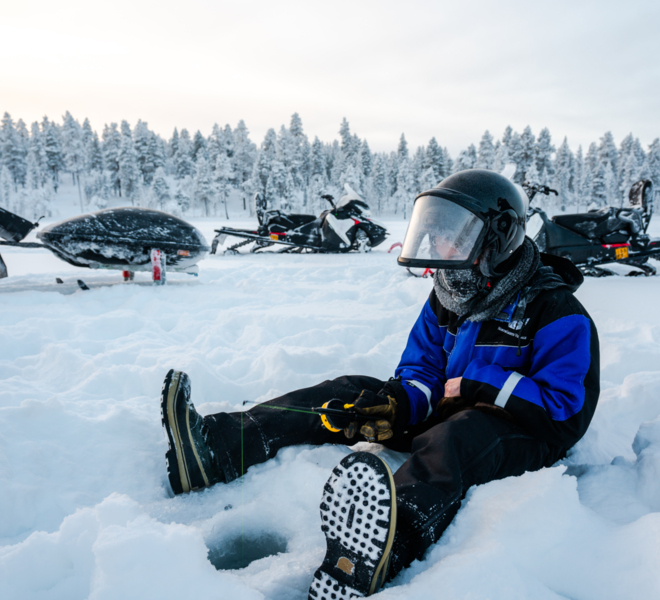 Glide through remote forests and fells on an electric snowmobile, ending at a wilderness lake for fishing.